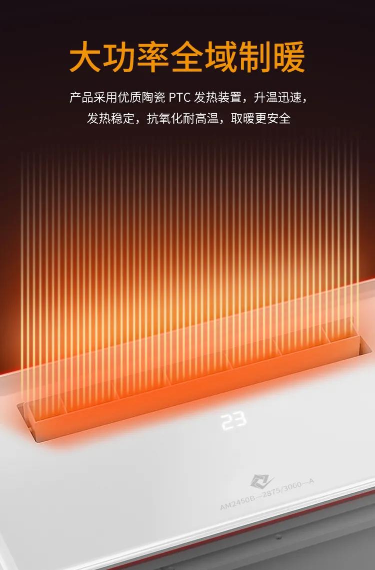 智享MAX浴室空調(diào)采用優(yōu)質(zhì)陶瓷PTC發(fā)熱裝置,雙電機(jī)、雙風(fēng)輪設(shè)計,2800W大功率內(nèi)循環(huán)強(qiáng)效加熱,快速達(dá)到理想室溫;120度智能廣角擺風(fēng),人性化控制出風(fēng)方向,擺風(fēng)無死角,全域覆蓋暖風(fēng),均勻布熱,讓溫暖散布每一寸空間。