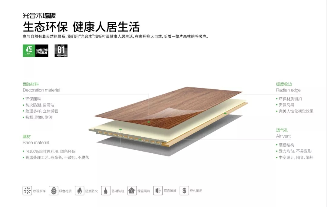 歐斯寶光合木墻板由原生純木木質(zhì)纖維通過(guò)高溫聚合擠壓成型工藝而成,產(chǎn)品符合國(guó)內(nèi)環(huán)保標(biāo)準(zhǔn)及歐盟E0級(jí)最高等級(jí)的環(huán)保標(biāo)準(zhǔn),無(wú)甲醛、無(wú)輻射、無(wú)污染,環(huán)保可再生,生產(chǎn)過(guò)程中沒(méi)有添加任何有害原料和膠水粘合,是貨真價(jià)實(shí)的新型室內(nèi)環(huán)保裝飾材料。