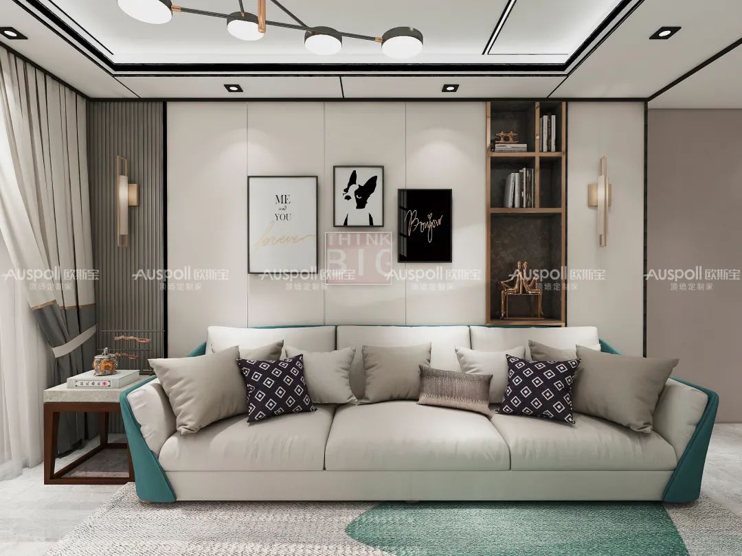 客廳以灰白為主色調(diào),低調(diào)內(nèi)斂的是“無爭”的處事態(tài)度,背景墻用幾幅精致的裝飾畫鋪成,綠色地毯點(diǎn)綴,告別單調(diào)的客廳搭配,增加整體空間的溫馨舒適。