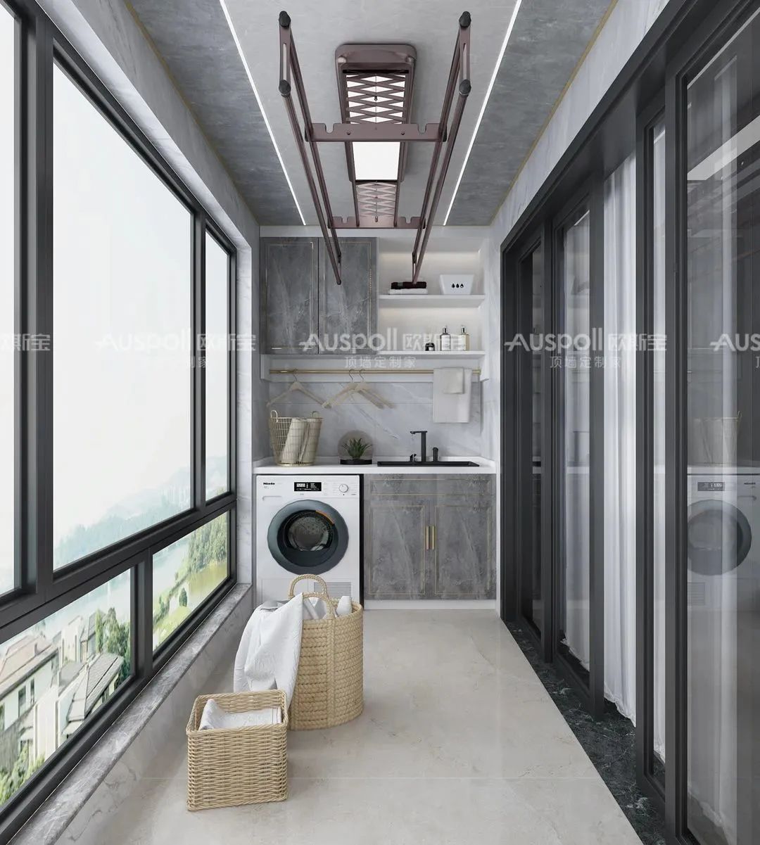 陽(yáng)臺(tái)又能實(shí)現(xiàn)衣物晾曬,同時(shí)又兼具休閑娛樂(lè),應(yīng)該是年輕人的向往。因此,陽(yáng)臺(tái)的設(shè)計(jì)更加注重極簡(jiǎn)的設(shè)計(jì)理念。智能伸縮晾衣架搭配蜂窩大板,完美詮釋了現(xiàn)代極簡(jiǎn)風(fēng)。