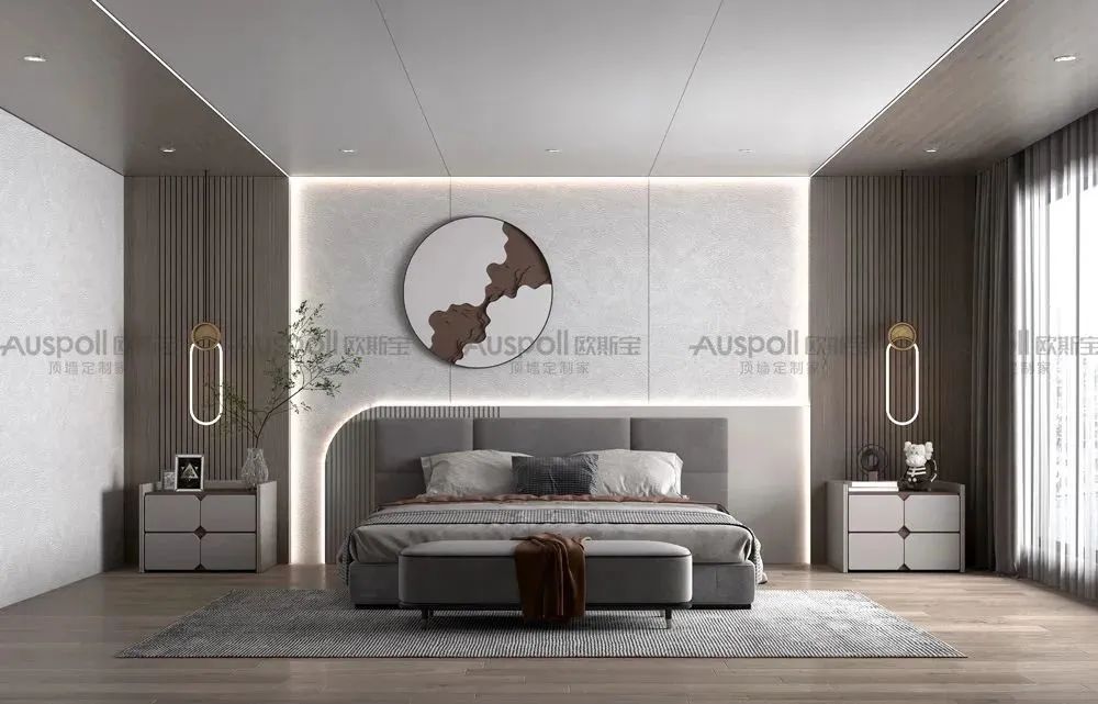 在主臥的設(shè)計(jì)上,以無(wú)界大板2.0為基礎(chǔ),巧妙利用吊頂分區(qū),實(shí)現(xiàn)動(dòng)靜分離的效果。背景墻上沒有過(guò)多的裝飾物,搭配無(wú)主燈設(shè)計(jì),讓整個(gè)房間增添了明暗交織的效果。臥室的設(shè)計(jì)拋棄掉過(guò)多冗雜的設(shè)計(jì),精心打造簡(jiǎn)單大氣與實(shí)用并存的舒適空間。