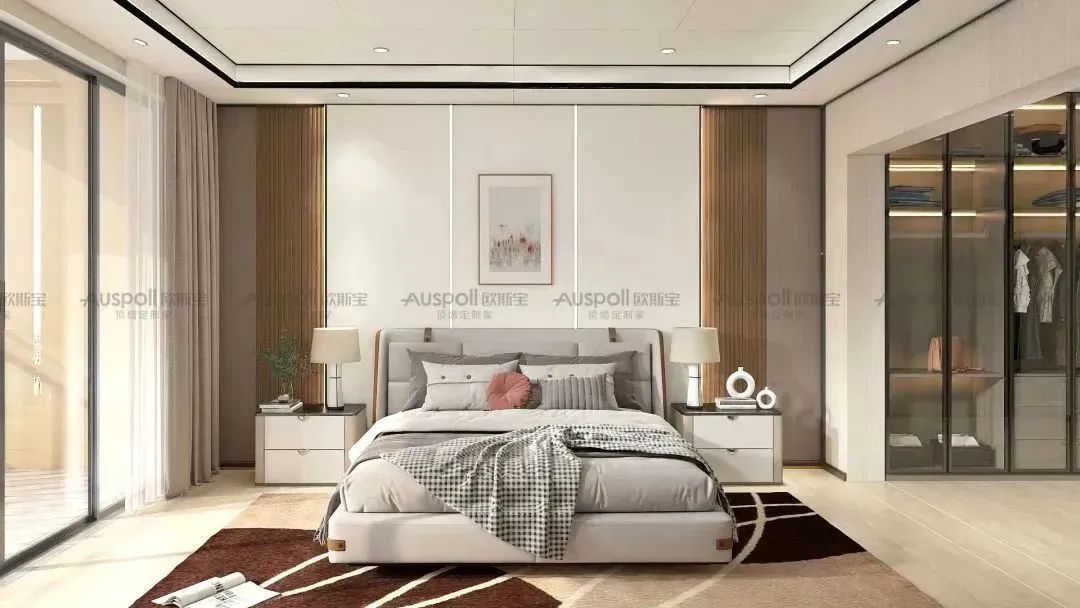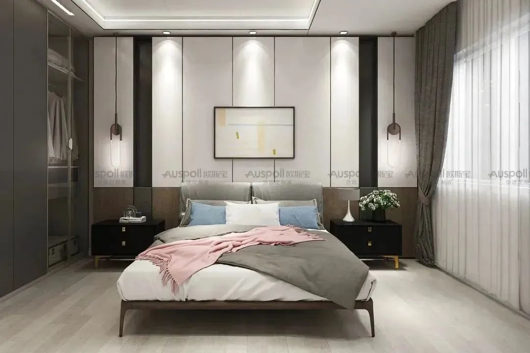 臥室背景墻中式護(hù)墻板+柜子組合+裝飾畫(huà),視覺(jué)立體豐富、質(zhì)感細(xì)膩。新中式之美,在于簡(jiǎn)約靈動(dòng)、優(yōu)雅含蓄,有格調(diào)而不顯壓抑的文化意蘊(yùn)。