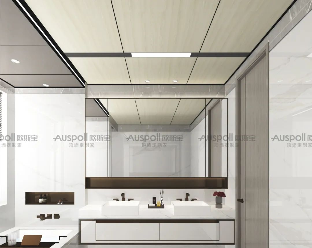 衛(wèi)生間屬于比較特殊的空間,吊頂建議選擇鋁蜂窩材質(zhì)的。和石膏板吊頂相比,歐斯寶無界2.0蜂窩大板耐臟防潮防水,拆卸安裝也比較方便。