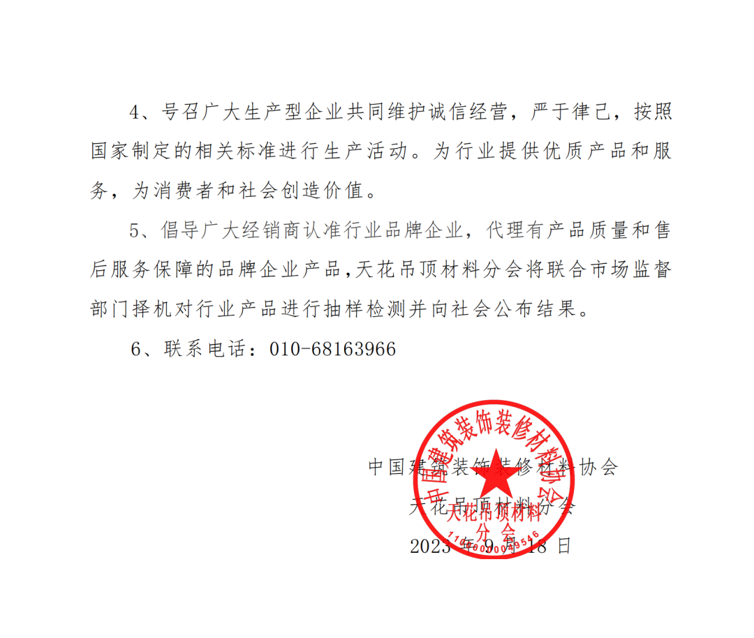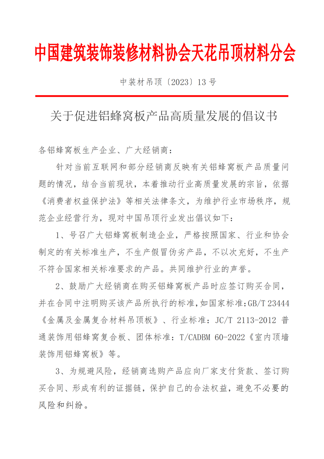 針對(duì)當(dāng)前互聯(lián)網(wǎng)和部分經(jīng)銷(xiāo)商反映有關(guān)鋁蜂窩板產(chǎn)品質(zhì)量問(wèn)題的情況,為維護(hù)行業(yè)市場(chǎng)秩序,規(guī)范企業(yè)經(jīng)營(yíng)行為,中國(guó)建筑裝飾裝修材料協(xié)會(huì)天花吊頂材料分會(huì)對(duì)中國(guó)吊頂行業(yè)發(fā)出倡議如下: