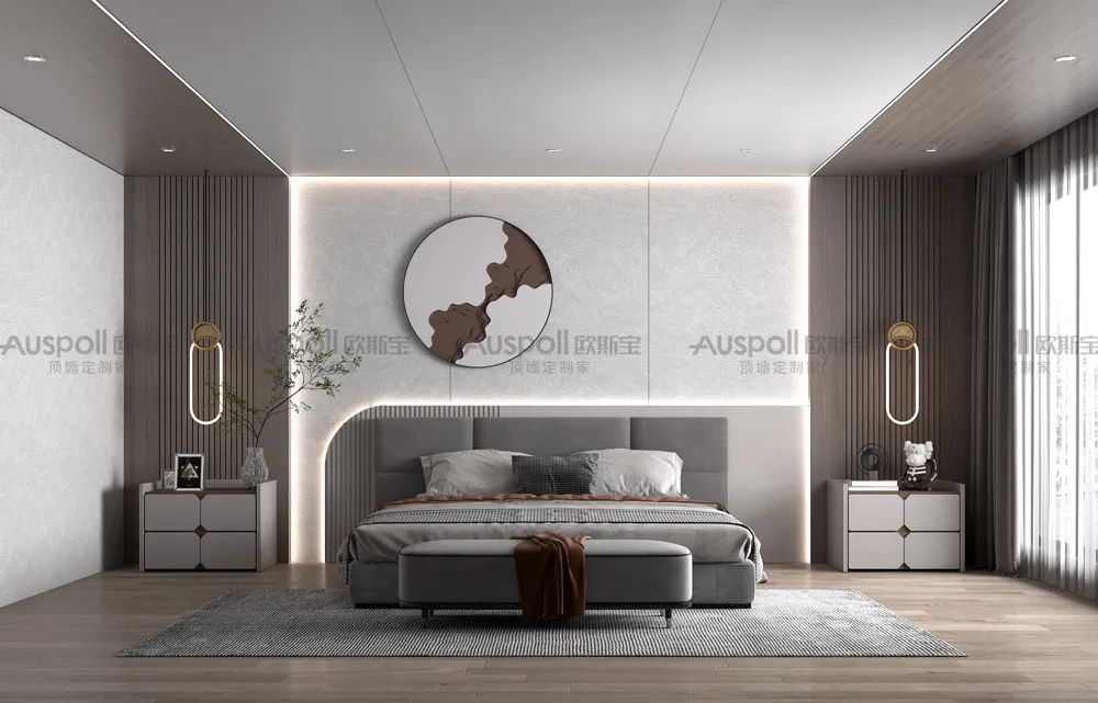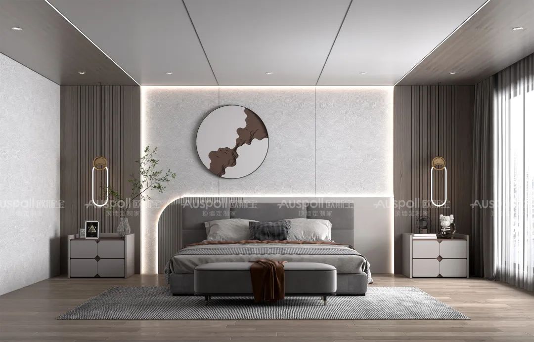 臥室的墻面設(shè)計(jì)通過(guò)平板的墻板與條紋木格柵拼接呈現(xiàn)出線條來(lái)。