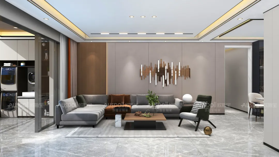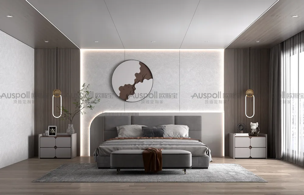 歐斯寶頂墻一體化將墻面和吊頂?shù)念伾M(jìn)行統(tǒng)一,使它們呈現(xiàn)出一種整體的和諧美感。再用墻板作為空間的分隔元素,劃分出不同的功能區(qū)域,使家居布局更加合理。