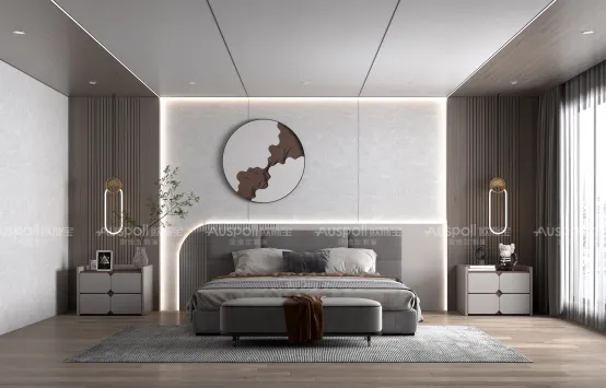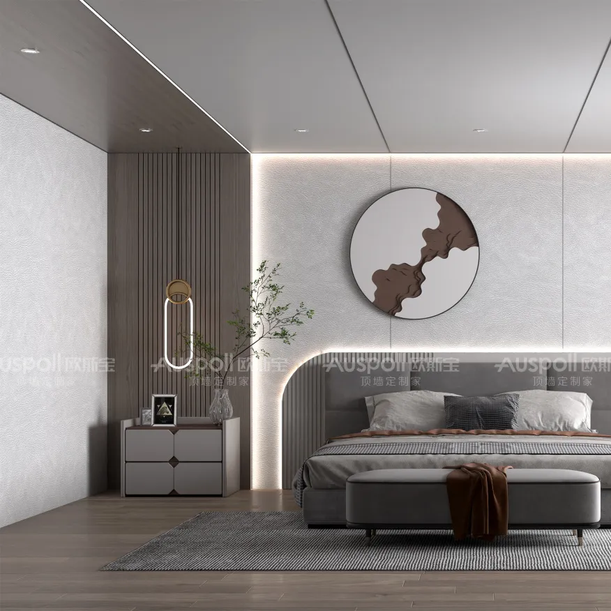 臥室背景墻采用歐斯寶木飾板+格柵在燈光的烘托下,意境悠遠,強化了自然紋理的細節(jié)質(zhì)感,讓墻面更具層次感和藝術(shù)感。再搭配上燈帶,增添一種靈動而輕盈的視覺效果。
