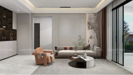 作為家庭活動的中心,客廳的背景墻設(shè)計尤為重要。大理石紋的冷硬質(zhì)感與木飾板溫暖質(zhì)樸相結(jié)合,不僅增加了視覺層次感,也營造出一種既高級又不失自然氣息的空間環(huán)境。