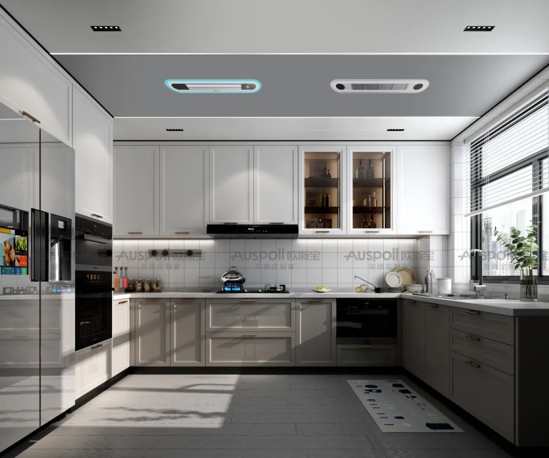 嵌入式設(shè)計:將洗碗機、蒸烤箱、智能冰箱等嵌入櫥柜,整潔美觀;廚房空調(diào)隱藏安裝:嵌入吊頂,不占空間還能帶走夏日悶熱。