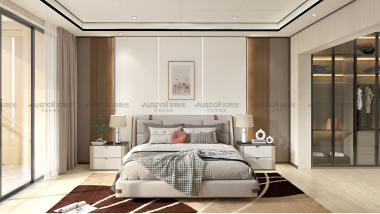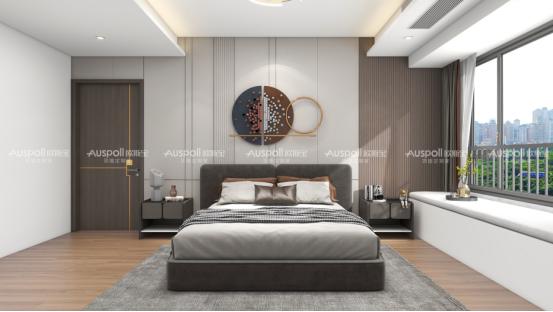 臥室背景墻采用墻板+格柵搭配,在燈光的烘托下,意境悠遠(yuǎn),讓墻面更具層次感和藝術(shù)感。通過(guò)吊頂和墻面隔音隔熱性能,為居住者打造了一個(gè)安靜舒適的睡眠環(huán)境。