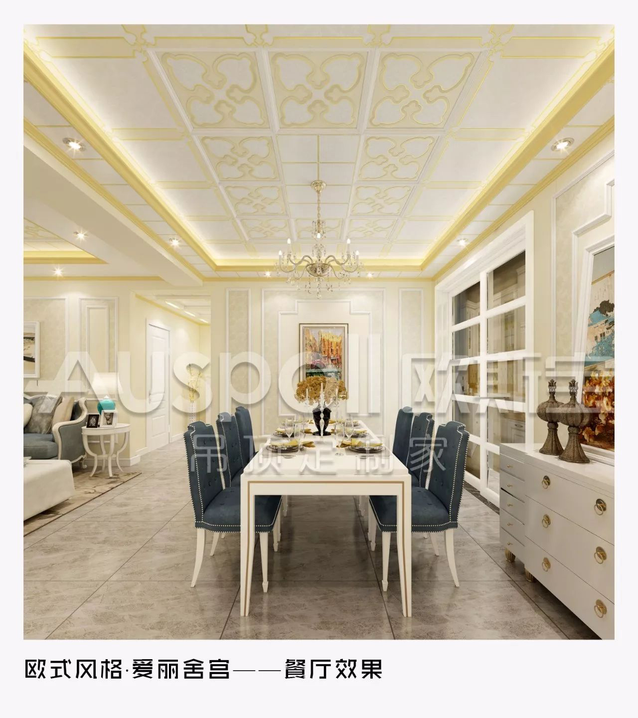 歐式風格的餐廳明亮奢華,不失浪漫氣息;愛麗舍宮在餐廳的搭配,以600規(guī)格為主,可選搭300襯板;搭配方式靈活,搭配效果美觀大大方;